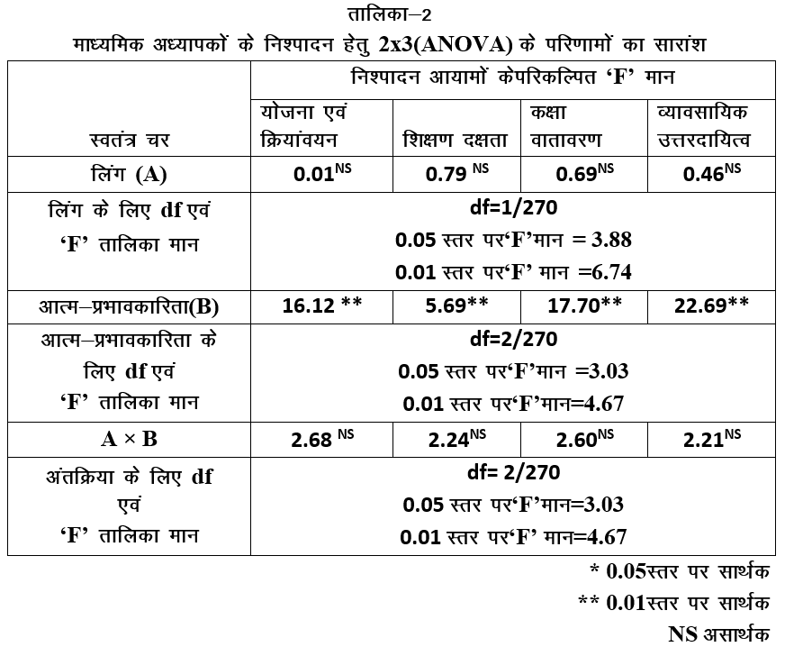 माध्यमिक अध्यापकों में निष्पादन आयामों के मध्यमान अंकों पर लिंग और आत्म-प्रभावकारिता के मुख्य एवं अंतःक्रियात्मक प्रभावों (Main and Interaction Effects) के लिए ‘F’ मानों की गणना की गई। परिणाम तालिका-2 में प्रदर्शित हैं।