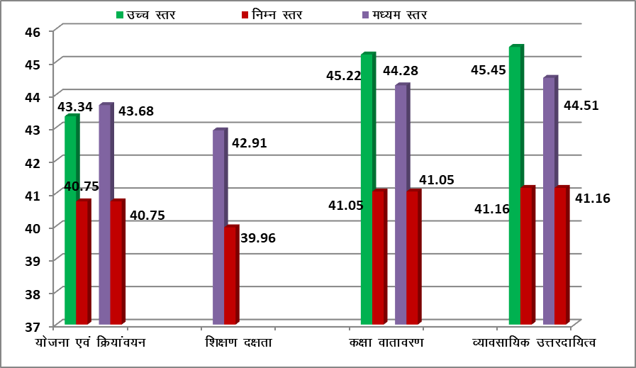 तालिका-3 से स्पष्ट होता है कि माध्यमिक अध्यापकों के निष्पादन आयाम ’व्यावसायिक उत्तरदायित्व’ पर उच्च व निम्न स्तर एवं मध्यम व निम्न स्तर के आत्म-प्रभावकारिता समूहों के मध्य में t-मान क्रमशः 5.54 एवं 5.45 सार्थकता स्तर 0.01 के स्वातंत्र्य कोटि (df) 182 पर ‘t’ तालिका मान 2.60 से अधिक है, अतः उच्च व निम्न स्तर एवं मध्यम व निम्न स्तर के आत्म-प्रभावकारिता वाले माध्यमिक अध्यापकों की ’व्यावसायिक उत्तरदायित्व’ में सार्थक अंतर है। यद्यपि ’व्यावसायिक उत्तरदायित्व’ पर उच्च आत्म-प्रभावकारिता वाले माध्यमिक अध्यापकों का मध्यमान (45.45) है, जो कि निम्न आत्म-प्रभावकारिता वाले माध्यमिक अध्यापकों के मध्यमान (41.16) से अधिक है। इसलिए हम यह कह सकते हैं कि उच्च आत्म-प्रभावकारिता वाले माध्यमिक अध्यापक, निम्न आत्म-प्रभावकारिता वाले माध्यमिक अध्यापकों से अधिक व्यावसायिक उत्तरदायी हैं।इसके अतिरिक्त ’व्यावसायिक उत्तरदायित्व’ पर मध्यम आत्म-प्रभावकारिता वाले माध्यमिक अध्यापकों का मध्यमान (44.51) है, जो कि निम्न आत्म-प्रभावकारिता वाले माध्यमिक अध्यापकों के मध्यमान (41.16) से अधिक है। इसलिए कह सकते हैं कि मध्यम आत्म-प्रभावकारिता वाले माध्यमिक अध्यापक, निम्न आत्म-प्रभावकारिता वाले माध्यमिक अध्यापकों से अधिक व्यावसायिक उत्तरदायी है। माध्यमिक अध्यापकों में’व्यावसायिक उत्तरदायित्व’ पर उच्च, मध्यम और निम्न आत्म-प्रभावकारिता स्तरों के मध्यमानों के सार्थक अंतर को आरेख-1में प्रदर्शित किया गया है।