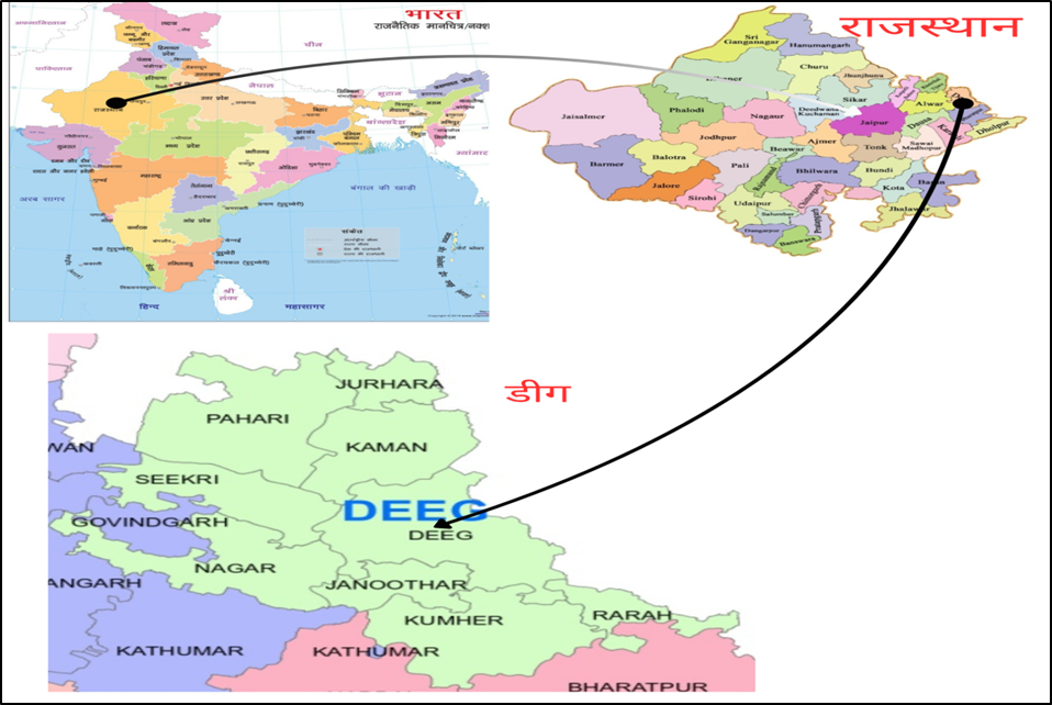 किसी भी भौगोलिक शोध की विश्वसनीयता उसके अध्ययन क्षेत्र की स्पष्टता और अपनाई गई कार्यप्रणाली की वैज्ञानिकता पर निर्भर करती है। प्रस्तुत शोध पत्र का केंद्र बिंदु राजस्थान का नवसृजित’डीग जिला’ है। भौगोलिक रूप से यह क्षेत्र 27 डिग्री 28 मिनट उत्तरी अक्षांश और 77 डिग्री 20 मिनट पूर्वी देशांतर के मध्य स्थित है4। यह जिला राजस्थान की पूर्वी सीमा पर स्थित है, जो उत्तर प्रदेश के मथुरा और हरियाणा के नूंह जिले से लगा हुआ है। भौतिक दृष्टि से यह क्षेत्र ‘यमुना के कछारी मैदान’ का विस्तार है, जिसके उत्तरी भाग (कामां और पहाड़ी तहसील) में अरावली पर्वतमाला की अवशिष्ट श्रेणियां विद्यमान हैं। रूपारेल यहाँ की प्रमुख मौसमी नदी है, जो ऐतिहासिक जल प्रबंधन प्रणाली का आधार रही है। सांस्कृतिक रूप से यह संपूर्ण क्षेत्र ‘ब्रज 84 कोस परिक्रमा’ के अंतर्गत आता है, जो इसे धार्मिक पर्यटन का केंद्र बनाता है।