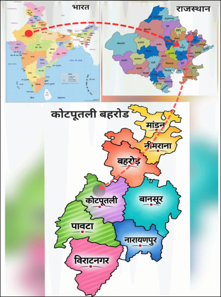 चित्र 1: भारत एवं राजस्थान के संदर्भ में कोटपूतली बहरोड जिले की अवस्थिति