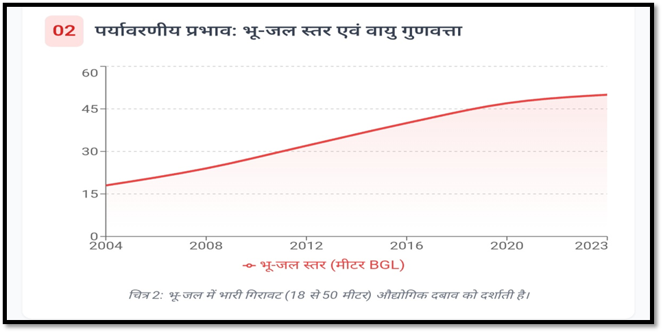 | वर्ष | भू-जल स्तर (मीटर BGL) | औद्योगिक जल खपत (ML/वर्ष) | PM10 (µg/m³) | CO₂ उत्सर्जन (टन/वर्ष) |