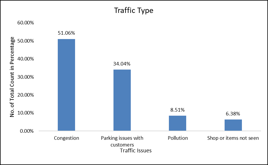 The upper bar graph indicates traffic type faced by shopkeepers and hawkers. Majority of people faced congestion which was 51.06% of shopkeepers facing congestion due to road construction, accidents, long time singles so the road was fully loaded with the vehicles. Other is parking issue with customers having 34.04% compare to others. Because the width of the road is small and due to parking beside the road it gets rush to that particular area and people face parking issues other reason is many shopkeepers followed no parking behind their shop so customers and other people find difficult to park their vehicles near that road. In next category pollution having 8.51% of shopkeepers and hawkers facing pollution emitted from the vehicles such as smoke, loud Noice of horns. But this may have very less percentage of 8.51% because many shops having doors to get less affected from it and mostly hawkers get affected easily because they just having their stall with no doors. Last category of items not seen said by shopkeepers indicates that due to traffic their shop items aren’t visible to the people so they faced issues like people not coming because they didn’t see the shop items.