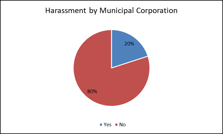 The uppers pie chart represents if shopkeepers and hawkers get harassed by the municipal corporation people. 20% of shopkeepers and hawkers gets harassed by the municipalcorporation for having their shop in that area.the harassment they get such as raids, dispute over licence, they demand for continuous payment and force them to give so they may feel gets harassed by the municipal corporation people. others they didn’t gets harassed because they may have licence and know their right that if they have their own legal shop with licence then no one can harass them fours fully.And they know about how to file complain against them.