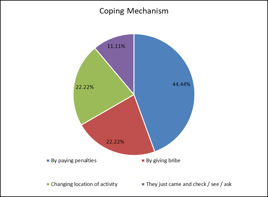 This upper pie chart represents coping mechanism of the shopkeepers and hawkers that how they deal withthe municipal corporation people while they harassed them for having shop in thatarea.the first category of by paying penalties having 44.44% of shopkeepers and hawkers paying penalties to the municipal corporation peoplewhile they harassed them. Because they have fear of if they won’t pay them, then they permanently closed their shop. But these shopkeepers and hawkers want to know about their rights so they didn’t get harassed. Another reason is having illegal shops such as with no licence so they easily get trapped and pay to them. Another category is by giving bribe is having 22.22% of shopkeepers and hawkers fallen under this category that they give bribe probably this type of shops didn’t have legal licence so they charged them by giving bribe to saved their shop that’s why they give. Next category is changing location for activity having 22.22% of shopkeepers and hawkers change their location for activities mostly hawkers do that they change location for activity to sale their goods to people. because municipal corporation people want legal licence of a particular shop of a particular area. but most of the hawkers and shopkeepers didn’t have that so they change their location for selling their goods. Last category is having different coping mechanism they said that the municipal corporation people just came and check at once they didn’t ask for any kind of penalties to pay to them. This may indicate that they came to check their shop licence, their products because is they have licence to sale these products probably medical shops they have drugs as well but they have licence to sale it as a medicine with legal doctor’s prescription so they need to check about that.