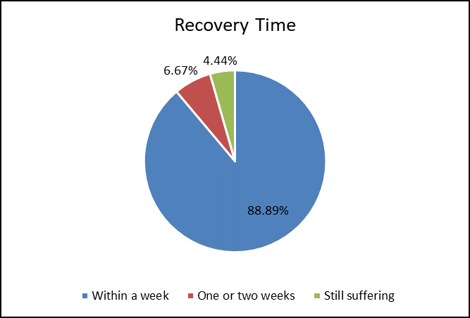 This upper pie chart indicates that how much time to gets recover from the affected pollution. The highest percentage of category is within a week having 88.89% compare to others. That’s a really good thing that people not get suffer much they healed within a week through it. Second category is one and two weeks having 6.67% of people probably they are elderly people and also a people who gets suffer more than the other because every person’s immunity power are different than others to heal from it. Last but not the least is still suffering category having 4.44% of the shopkeepers and hawkers come under it. Through this data we come to know that how much pollution releases from the vehicles in traffic areas are more harmful that people still suffer from it. Majority of the people who are hawkers because they just have their stall with no door facility so they easily get affected through it. Solution is that vehicles have to use less fuel and use public vehicles, if it’s an emergency to use own vehicle at that time they used their own vehicle. And instead of fuel people used E-vehicles. Also, planting trees are more important to heal from the affected pollution because in urban areas main problem is they have fewer green areas than the rural area. so, planting a tress beside the road is must important to cope up from it.