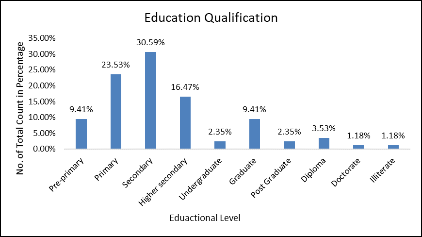In this upper bar graph, it represents the education qualification of shopkeepers and hawkers. In the R/S ward of Mumbai. The first category is pre-primary education qualification category people. they studied till primary because at their time the importance of the education was not that much as compare to now a day. So, they just studied till primary and open their shops and stall for earning purpose. Another possible reason is family responsibility so they studied and learn from their family members about how to earn in the shop and stalls. The next category of people is the primary education category people. they studied till their fourthand fifth class and gets involved in their family business this category is the second highest category of people of education qualification of people.The highest category of percentage is the secondary education qualification people. which was 30.59% compare to other category of people. it indicates that the people who owned their shops and stall they are studied till secondary due at their time family business such as shops are more important to handle so, after their completing their secondary education, they involved in their family business to handle shop also other reason is that they want to study till their secondary and at very young age they want to handled it. And it’s good that more people give an importance to their education first. The other category is Higher secondary education qualification of people. it’s a third largest category of people after secondary and primary. 16.47% of people completed their education till 12th standard. And they involved in their business and also, they open their shops and stalls by own because they get legal licence after their eighteen years of age. So, they studied till 12th standard quickly involved in bossiness for improving and earning purpose. Next is the undergraduate category of people same percentage of people as the post graduates which was only 2.35% of people it’s a very less number because after people gets literate means they are capable of reading and writing and till they gets legal right to handled their shop they not showing much interest in their studies and want to open start-ups by their own that’s this both category of people are less because only few of them taking knowledge and studied to gets more information to improved their business. Graduate category of people having 9.41% of people. which was forth highest category of people in terms of education qualification same percentage as primary category. Most of the people are more aware about importance of education and they want to learn more about their bossiness and they gave first importance to their education by that time they involved in start-ups and side by side there education as well because people know that more education leads better employment opportunities that why this category of people having moderate level of percentage among the other category. Diploma category of people having 3.53% of people that shown people much interested in studies as well as their passion of having their own business and also the possible reason is that they want to gets more information for having multitask aspects towards their career. Last but not the least category of doctorate and illiterate peoplemost of people do doctorate and then the enter in the business after their career like teaching and other they done and also, they studied till doctorate and as they passionate to open their own business they open after their completing there PhD. And in the case of illiterate people because of their family shops are there so they didn’t give much important to the education to learn and then enter in businessas they grown up, they handled their family business such as shop and stalls open by themselves.