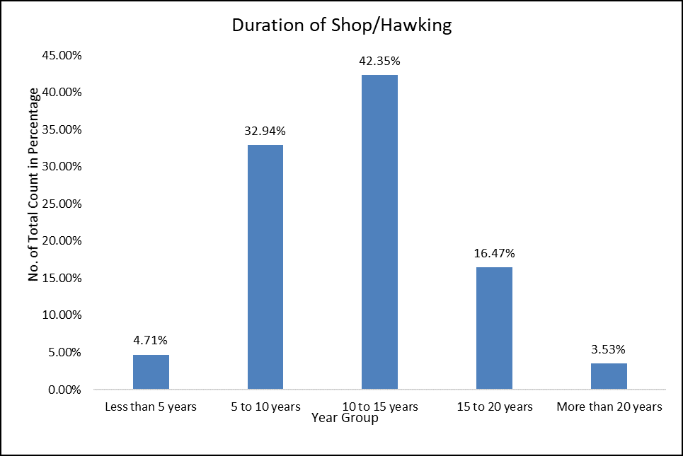 This upper bar graph shows how long shopkeepers are hawkers in the business. Most of the shops are running from the 10 to 15 years which was 42.35% of total number. This shown that people are actively engaging in their business and having their own shops still many years. Next category is 5 to 10 years in this category of having shops 32.94% of people having their shops since 5 to 10 years. It shows that lot of business are fairly stable and they survived to buildcustomer’s trust. Next category of 15 to 20 years having 16.47% of shops running from 15 to 20 years its suggests that only fewer business sustain from very long period. In less than 5 years category of shops having 4.71% compare to others. They newly open their shops in those areas for sailing their goods to the people. last category is more than 20 years. In this category having 3.53% of people having their shopssince longer time but they having less percentage compare to all. Because they shifted their shops to another areas and other possible reason is that they sale it to other people to owned shop.
