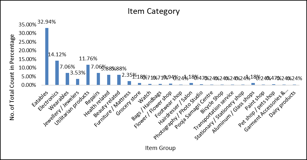This upper bar graph represents which items they sold in their shops such as eatables, wearables, electronic, grocery also other like dairy productsand etc. the largest data of having eatables of 32.94% of total percentage compare to all they may having their own food stalls or bakers and, in that ward, maximum people having eatable shops, because people may purchase as per their need of food. Electronics are in the second largest of having 14.12% of compare to other. Indicates growing demand for gadgets and electronic goods. Next is repairs having 7.06% of people who having their repairing shops such as car repairs, repairing materials they have in that area. followed by jewellers, utilitarian products and others are also in that area. because now a days people having more facilities so they need more different variety of the shops to full fill their needs. And it’s good that in R/S ward having variety of shops so people didn’t find any trouble to find particular thingbehind that area.